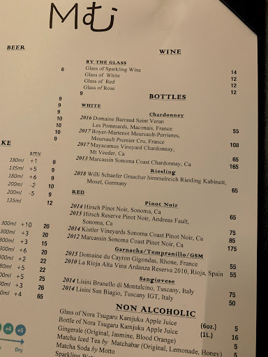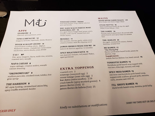 The main seating--3 large 4-top wooden tables with matching benches and stools joined in the center of the small dining room--is the focus of a single light fixture hanging over the space. Immediately entering the restaurant, your eyes focus on the aesthetic ramen and plated "treats" softened by the vignette that hides the jackets hanging loosely on the hooks lining the walls. The minimal staff is friendly; I enjoyed talking to the server and watching the chefs working behind the counter While the flavor profiles of the ramen are unique, Im not sure if these bowls are worth the prices (average bowl was about $18 and appetizers $16) and effort of making the visit. I liked the Ill Shoyu more than the Mu Ramen, but perhaps because I love duck. Unfortunately, as someone who regularly eats oxtail and oxbone broth, I couldnt discern the oxbone in the Mu Ramen broth, but I immensely enjoyed the cucumber notes. I will likely return because novel flavors often require a second taste. I was happily surprised by the nuances in the Tebasaki Gyoza or deep fried chicken wings stuffed with Hudson Valley foie gras and brioche, which were essentially boneless except for a small bone to use as a hold while consuming. The spicy mustard green side is very spicy and better mixed into the broth or eaten with the noodles. Chashu is similar to rounds, very fatty and come at a generous sized slice, while corned beef on the Mu came in two small slices, which placed side by side looks like the size of about 6 stacked playing cards. Both Mu Ramen and Ill Shoyu came with wavy ramen noodles, and the poached egg (extra topping) didnt add too much value to the Mu Ramen. The restroom had a similar nice atmosphere. The wait was surprisingly long for 45 minutes before closing at around 9:15 PM on a weekday night.