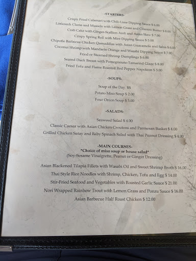 For the side of town that the restaurant resides in, this is a culinary gem. The food is delicious, albeit on the pricey side; well worth it when you take in the atmosphere and overall experience. Modest portions, an excellent seafood menu, and the clean, modern environment make for a great meal. I recommend the tuna steaks, fresh and well prepared. I also recommend the green tea rice gum dessert balls. My dessert was light and refreshing after a tasteful meal, a nice change from heavy, cream-laden and carb heavy desserts that you encounter in Middletown steak houses. I would use this restaurant for a first date or personal business meeting. The ambience is mature and friendly without being overly intimate. Makes a great first impression. Highly recommended.