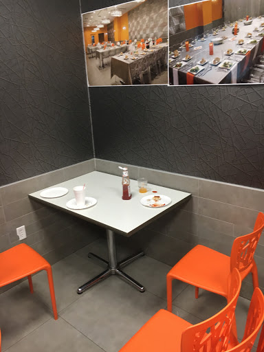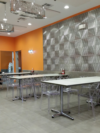 This place is very clean with ample dining space. Decor is bright color. I would not call this an intimate dining experience as the floor plan is quite open and dining hall style,but its great for groups and families. My family ate pizza and fries, but everything I saw coming out of the kitchen, from salads to sushi, looked fresh and tempting. Pizza prices were very reasonable for kosher pizza, however the "family size" French fries seemed small for the price. I would definitely recommend eating here.