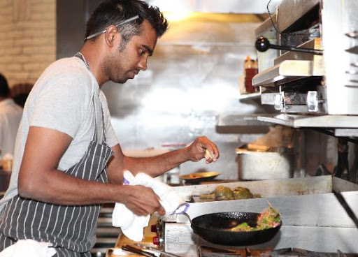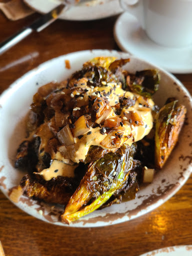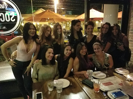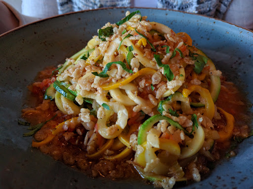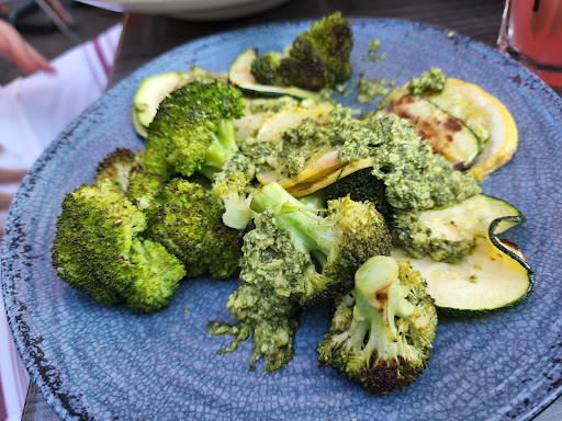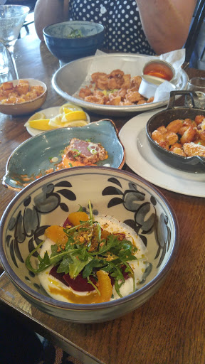 Food always tasty, interesting cocktails. Wood-fired pizzas are amazing. Rice bowls with various toppings delicious. Service is always pleasant, can be slow at times. Very active bar, especially weekends. No sound dampening so loud when busy. Convenient location, though parking lot often filled leaving on-street metered parking (free after 6pm and Sundays). Nice for lunch. Outdoor seating on busy road.