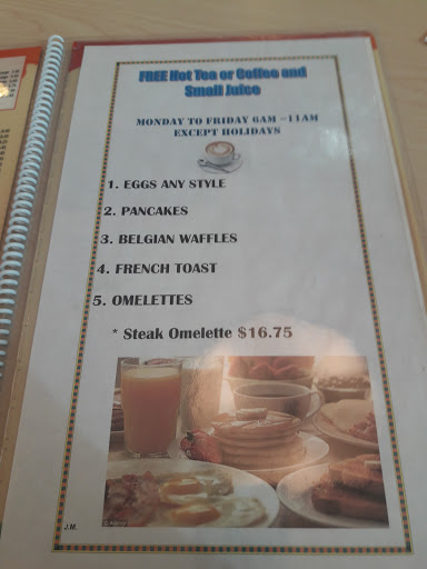 I have eaten breakfast here every day for the last two weeks. The food is excellent. The service does tend to be a bit slow. I did have a bad experience with a waiter (Manager?) yesterday 02/17 at 0530. Having been informed the day before that a small glass of juice was included in my meal, I repeated that understanding to my waiter and asked for a glass of cranberry juice. I enjoyed my meal and when I received the bill, I noticed a $3.50 charge for the juice. When I reminded the cashier of my understanding he and my waiter conversed loudly in front of me in a language I do not understand. When my waiter walked away from me without a word, the cashier handed me the bill and said juice was free only between 6-11 am and that the waiter refused to adjust the bill. I paid the bill under protest and remain very unhappy with their treatment of a regular customer.