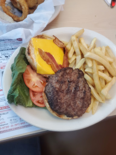 My husband and I were driving through nanuet for a late lunch (approx 3 pm) and decided to stop for a quick bite. So regretted that we did. The table want cleaned when they seated us and that should have tipped us off, but oh well. I ordered a bacon cheeseburger deluxe and he ordered the macaroni and cheese special with a cup of chicken soup. The chicken soup tastes like salty water, and we waited an additional 30 min for the mains to arrive. The Mac and cheese looked fine, but I mentioned to the waitress that the burger deluxe also comes with onion rings which were missing. She answered no problem, and promptly returned with 2 onion rings in HER BARE HAND that she promptly dropped over my fries onto my plate. Needless to say I asked to see the manager. She returned with another server and they began to discuss the serving of the food with bare hands in front of us in Spanish. At which point I answered in fluent Spanish that yes she brought the food with her bare hands, and I dont think youre the manager. He apologized and said that he wasnt and said that he would bring us a new plate and that the manager wasnt necessary. I said it absolutely was necessary and the manager came to the table. She offered us anything on the menu gratis, which I politely refused, because if thats how the waitstaff are trained in terms of hygiene and food safety, I cant really trust your kitchen. She offered to let us into the kitchen to watch our food being prepared, but I had lost my appetite by then. Needless to say, we didnt pay for the drinks or tasteless soup.