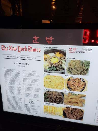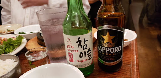 Authentic Korean food. Lovely bipimbap and soups. First affordable alcohol I found in NYC. A 350 ml bottle of soju for $15. Great starters. Loved the toasted seaweed and spicy Kim chee. Recommend. Some menu items are expensive in the $25-35 range but many are in the $15-18 range.