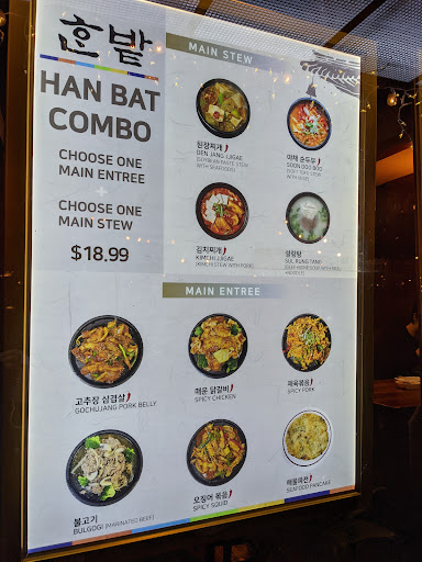 With the abundance of choices in the K-town we decided to try a new restaurant than our usual haunts. Hanbat looked busy and similar layout as many of it around it. Wood interior and tables and chairs. We were sat at a comfortable table towards the back. Our server quickly got our order of panjun(kimchi), Al Chigae and Kimchi Bokum(w/ pork). The banchan was a bit lack luster in my book compared to others I’ve tried. The Kimchi a favorite had a odd taste to it which I didn’t like and I love Kimchi. The pancake was crispy and was pretty good. The Al Chigae was comparable if better than some of the others I’ve tried. (It is one of my favorite dishes) Unfortunately, the same Kimchi in the banchan was used which made the plate not very good and the table did not like it. What I did appreciate was the non-rushed attitude like many of the other establishments in K-town where if you didn’t chew fast enough they’d probably come over to help if they could.
