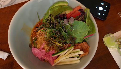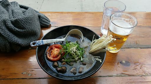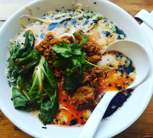 Great service. Great food. Wish there were more vegetarian options but i still wouldve have chosen the matcha shoyu. It had a soft matcha flavour with smokey undertones, with a little chilli paste it was perfect for me. The noodles were amazing. They were able to accommodate us when we asked for the kimchi fried rice without meat and it was amazing, it was the best combination of sweet and savoury. And the purple potatoe fries! They might be the best fries ive ever had. Definitely would come back!