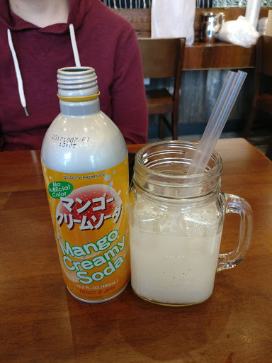 The space is awesome. Immediately upon entering, I noticed the large mural above the kitchen windows depicting ramen noodles as ocean. The tables resemble vintage sewing machine tables with large metal pedals that you can fidget with; they enable visitors seated across each other to ascend to a new level of footsie!