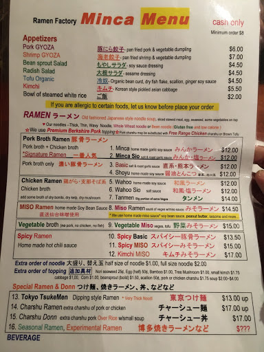 Cash Only ~~ I would personally recommend then more than Ippudo simply because of comfort feel and less wait time. Minca is a small restaurant. So there will be a few minutes of wait. Most customers are very consider that they are people waiting so the wait is not too long. 1. Tsukemen- Dipping style ramen with the choice of hot/cold noodle and broth flavor I chosed the Salt and Garlic broth with hot noodles. Dipping style was a bit of a hassle for me because I am a messy eater and often causes stain on my clothes. But this was a new experience for me. All the ingredients are serve separately from the noodles on another plate. I think this helps creates and clearly distinguished what each ingredient taste like separately and together with the noodles. One thing that took me by surprise is the salt and garlic level in the broth. The broth was a bit too salty to drink on its like the pork broth. The broth is better when it is used as a dipping sauce. 2. Pork Broth ramen - exceed my expectations. This was name as one of the popular options. The broth was consistent in flavor. I can not begin with the pork slice on both of the ramen. I personally do not eat meat because of certain texture I dislike. But these slices of pork are soft and easily to be pulled apart. The pork was well seasoned and flavorful even before the broth has submerged the slices. Both ramen plus tax and tips, our total was $34 The presentation was clean cut. Service was great. It is a small restaurant with little room to walk around, the server makes sure that you have what you needed. Often refilling waters and making sure customers enjoy their food. I personally love ramen, and this is one of the best ramen I have ate at a decent price.