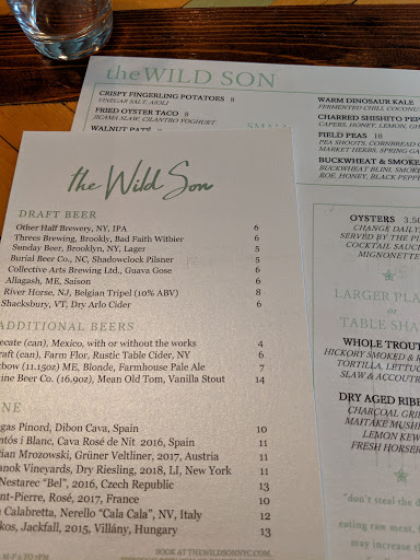 Amazing food and great atmosphere make The Wild Son one of my favorite places in NYC. Service is super friendly, and the bartenders make you feel truly welcome. The Raw Walnut Pate and the Braised Lamb Breast are my top picks, but the whole menu is delicious. And the oysters, dont forget the oysters!