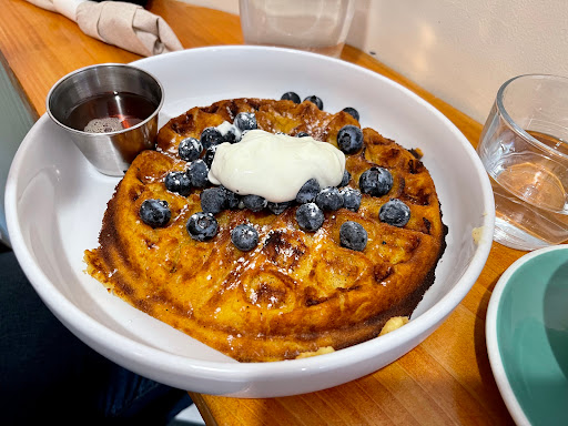 Got here at 10:30 on a Sunday and scooped up two seats at the bar before it got super busy. Good coffee, pancakes, and very fluffy scrambled eggs, with homemade hot sauce, if you are so inclined. Cocktail list was intriguing but our livers were still recovering from the day/night before. Cornmeal waffles are tasty and filling. Staff is friendly and accommodating.