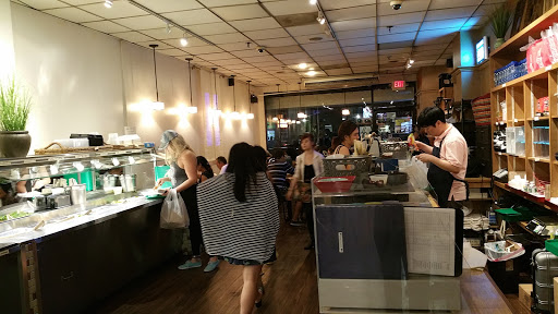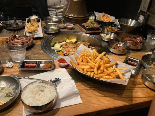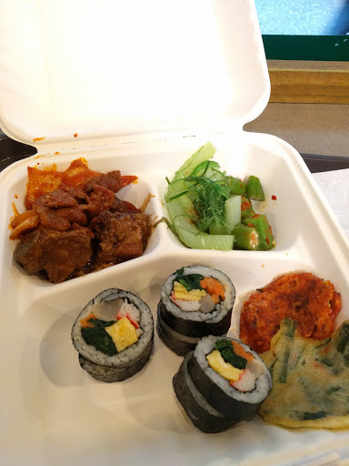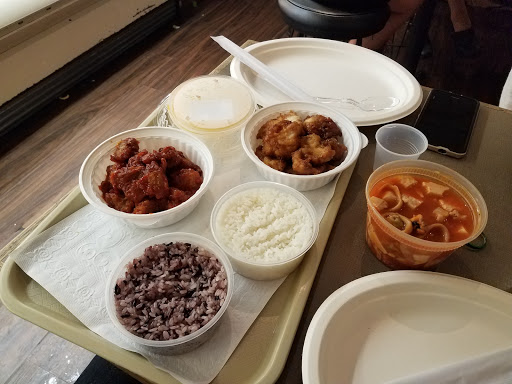 Right smack in the middle of Korea Town, this restaurant serves a variety of Asian foods, ranging from Korean kimchi or Japanese sushi, along with the usual candidates of rice, poultry, and drinks. The pricing is teetering over the edge, in light of the portion sizes, but theyre enough to fill you up. It gets quite crowded during most hours of the day, as there is little floor space and the restaurant itself seems to be a hot spot. Seating is cramped, and the lines can get long enough to wrap around tables where people are trying to enjoy their food. In sum, the food is good, the space is not.
