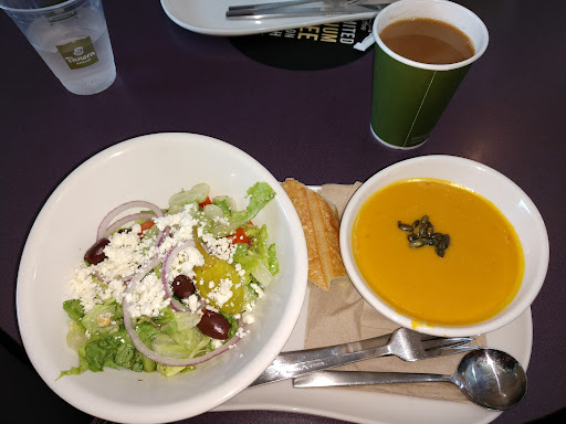 Everytime I seem to go to this Panera, there is ALWAYS an issue. They are always out of certain foods or out of bread bowls. Multiple times I have tried to order soup and in a breadbowl and they say they have no bread bowls. Then they serve me lukewarm soup and throw a tiny bag of chips along with it. I have seen the employees playing around and tossing things around like theyre playing a game. The restaurant as a whole seems a little dirty...I always notice garbage on the floor or residue on the tables. They are also really understaffed, there is always a line that is thousands of miles long with only one cashier working.