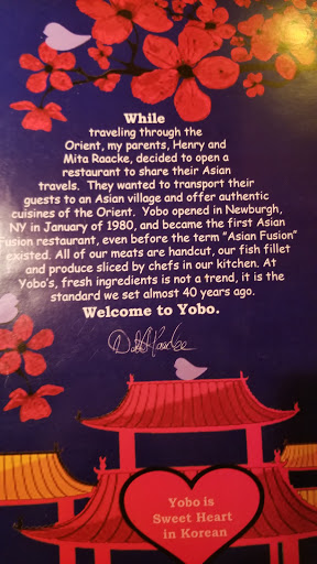 We drove into Newburg for a wedding this past Labor Day Weekend. We saw all the great reviews for Yobo and decided to give it a go. ATMOSTPHERE -- Whatever, I dont reaelly mind this soooo much, but it is super OVER the top with every type of Asian decor imagineable. I wasnt impressed by the sushi "bar" area next to the hallway for the bathrooms...it looked like a deli counter. The dark atmosphere brought me back to Benihana in the 1980s. I want a brighter room to eat in,,,overall? just a cheesy look CLEANLINESS -- with it being so dark, I felt it was a little dusty and not as clean as it could be. SERVICE -- while everyone seemed nice...we barely sat down before the waiter came over to ask us our order. We asked for a couple of minutes, and I think he literally gave us TWO before he asked again. We had various waiters, drink waiters, runners, etc...that we were constantly interrupted and seemingly rushed out...although there was no one waiting for our table.... DINNER -- Sushi, the sushi was "okay" that is it.. The same level fo sushi can be purchased at your supermarket for lunch. What upset me, was the mildew flavor on the pickled ginger. I LOVE pickled ginger and usually eat it after every bite of sushi, but after one bite, I realized something was off... After the Sushi my husband & I each got a dish. I got the Thai Firecracker Seafood. The description sounded wonderful, but it was basically a BIG bowl with a few shrimp and a it was in a gooey, thick cornstarchy sauce. I didnt eat it. My husband ordered Sai Woo Duck. We ate most of this b/c it was the least offensive and we were hungry. But the duck was charred on the outside and super dry....it was difficult to eat. That night around 230 AM I awoke sick with what I can only assume was food poisoning...approximately 6 1/2 hours after we ate. The rest of the weekend I felt sick and "off" anytime I looked at food....it was a horrible experience. Not sure why everyone thinks it is such a gem...I get better food from my local delivery, why go to a restaurant to get sick?