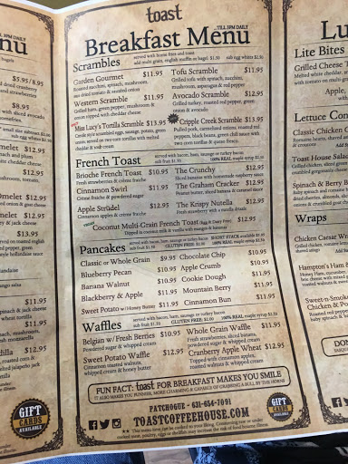 Ive eaten at Toast in Port Jeff in the past and never complained. I expected to wait in Patchogue just like I did in Port Jeff, but when you are told 45 minutes and its an hour and a half it gets annoying. However, we werent upset because we knew we would get good food and service. The atmosphere didnt disappoint, but the food did. When you order poached eggs and theyre over cooked and send them back and they come back the same way, its unacceptable. The waiter checked to see if it came out better and we advised it didnt. No appologies and no compensation. Needless to say, for 2 people with drinks and overcooked food it came to $51.33. I wont go back.
