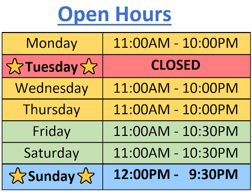 | Working: | 11AM–10PM 11AM–10PM 11AM–10PM 11AM–10PM 11AM–10:30PM 11AM–10:30PM 3–9:30PM |