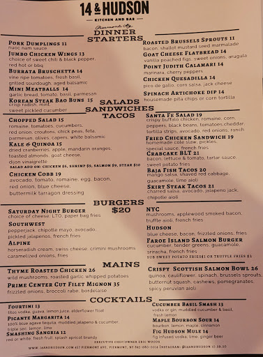 So happy with our meal. 14 & Hudson is nestled along the shore of the Hudson, in a nice cozy town of restaurants and shops. Our family (with two kids under the age of 10) decided to take a trip across the Tapan Zee for dinner during a trip, and we were so happy we did. Seating room was packed yet we werent squeezed for comfort. Service was excellent, and the staff was more than accommodating to our children. Food was great - gastropub fare, popular bar food but made with a unique flair and extremely flavorful. The breaded chicken was especially good! Decent beer and wine selection as well. We took a chance to go away from the bustle of Tarrytown and glad we did!