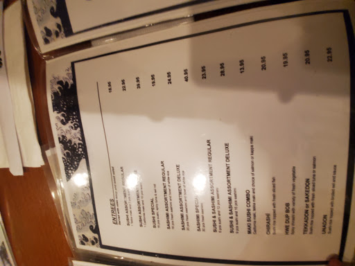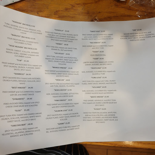 Hinode serves the best sushi Ive yet had in Rockland. The fish always tastes excellent. The portions are ample. They serve all the standard sushi rolls and pieces, sashimi platters, and rolls of their own design, as well as a variety of tasty Japanese entrees. Their menu boasts a number of vegan/vegetarian rolls and entrees. They will take requests for changes to their rolls as well. The decor is simply and tastefully done in blonde woods. The lighting is neither overly dark (like a bar) or overly bright (like a McDonalds). Its a happy medium. The staff are friendly and observant but not intrusive. Its a great place to take a date or a group of friends. Also, they pay attention to their regulars. If you go there often, they may treat you to a few complimentary pieces of some new roll of the sushi chefs creation. Last time I was there, they treated us to thin strips of banana and apple wrapped in a slice of avocado and fried tempura-style. It may sounds weird, but it was delicious!