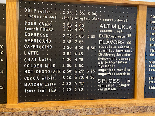 My favorite coffeehouse in town! A lot of flavor syrups, alternative milks, lots of space for homework, and a great atmosphere.