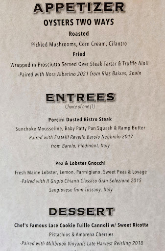 First let me say that in 50+ years eating in restaurants, I sent back food twice and never complain. However, I cannot let this go... I ordered what was listed as surf & turf; sirloin steak & shrimp with garlic mashed potatoes & yellow zucchini medley (or such)....$30. I got; 4 medium shrimp, 6, half dollar sized medallions of beef and a tablespoon of potatoes & veggies! Tasted very good though. My wife ordered fish & chips. Although fish was OK, if fell apart in the dish (fried in too hot oil ?). Got french fries as chips (oily ...fried in too cold oil ?). No bread, no salad included Waiter asked if she wanted vinegar ...yes please. Another beer....yes please. Never got the vinegar,..... got the beer for desert. A double expresso....Id say 2 ounces. $6 Bill $76. We had a gift certificate for $75 and left a $12 tip.... If it wasnt for the gift certificate, I would have sent back my $30 meal .....not worth it.