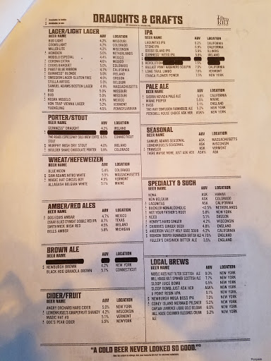 Lets be honest, you know what youre getting here. Food is hit or miss so stick to the basics, Chicken Tender Wrap with Guinness BBQ sauce is great Everytime. Lots of tables and elbow room. The waitresses are friendly so you should be too. NY that I mean, dont be creepy. Enjoy!