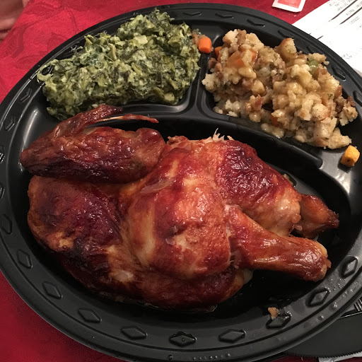Nice chicken, well roasted. Ribs and meatloaf available too. Sandwiches are great too. Great sides- love the cream of spinach, soup and salads are good. Corn, stuffing, cinnamon apples, string beans, all the sides are tasty. You get a corn bread to round off the meal. They also have desserts if you want. Sweet! They have kids meal for little ones! Coupons online every so often