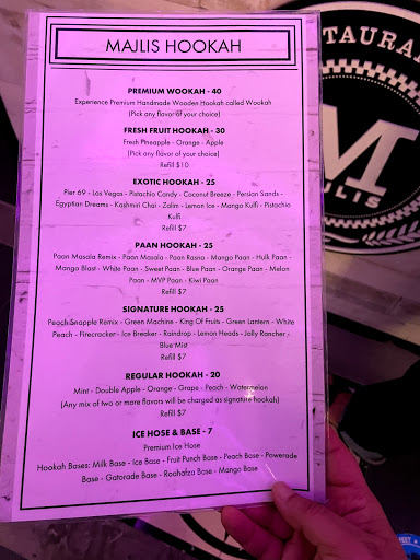 So im not one to write reviews, ever. But after looking for a solid Hookah Lounge to go on a date to, I came across Majilis. After reading all the reviews I saw every review say either amazing food, amazing hookah, amazing music, amazing service or all of them. Except for one reviewer who complained about the only girl who waits the tables saying how rude she was and what not. Disregarding the one bad reviewer I went to this place solely based on the reviews. I got seated right away, they brought me a hookah right away. I didnt get any hot foo, just fries and hummus but it was still really good and I saw other people eating the Hot plates which looked really good we just werent that hungry. I saw some people playing this really big weird board game and I was interested so I asked our waitress what it was and to maybe explain to us what the game was. This is the same waitress who got a bad review because she was the only girl there. She stayed with us for at least 5 minutes or so explaining the ENTIRE game to us very nicely and patiently. And after she came around every once in a while asking how we were doing with the game and seeing if we had any questions or wanted more service. She was very nice despite the reviewers bad thoughts and she made the experience that much better because we got to play a new game from Pakistan we just learned. I dont usually go to Hookah Lounges but this one I would for sure recommend to anyone to go to with friends or on a date and I would go again. Really chill for either honestly. They have cards and board games for you to play just ask. I was very happy with my experience here.