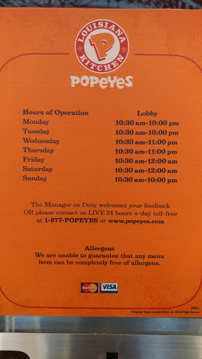 Out of the many Popeyes Restaurants Ive visited, this one is one of the cleanest. The staff are attentive and cordial. The restroom is clean, and you have to ask for permission to use it. The chicken is fresh, and the fries crisp.