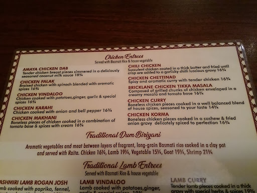 March 15, 2016 Amaya is an attractive restaurant. The ambience is quite pleasant, and on the evening we dined, the place was relatively busy with seemingly pleased customers. I liked the fact that one order of the Amaya salad was enough for two people, and the waitress accommodated us with two plates. I had the lamb biryani and asked for it medium spicy. It was not spicy at all; in fact, it was bland. And bland seemed to fit the Kashmiri lamb rogan, which was my partners choice, even though it was in fact medium spicy as ordered. Rather, it lacked the lively quality of Indian condiments in food we have had elsewhere, especially in London. My criticism concerns the cocktails we were served. My partner ordered a Sapphire gin martini; it was little more than slightly flavored water. There was hardly a hint of gin in it. The only thing you could say was that it was cold. I ordered a Manhattan. It, too, was a disaster. Hardly a trace of bourbon or rye and topped with ice shavings and a strange foam. The drinks had obviously been vigorously shaken for much too long instead of being briefly stirred in ice cubes. Martinis and Manhattans should never be mixed in shaved ice and shaken to death. To add insult to injury, when the bill came, there was a nominal charge of $7 for the weak Martini, but my single feeble Manhattan cost me $12. That, to me, was grossly excessive for a four-ounce glass of ice water.