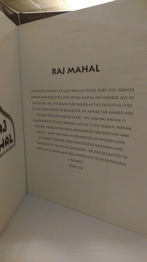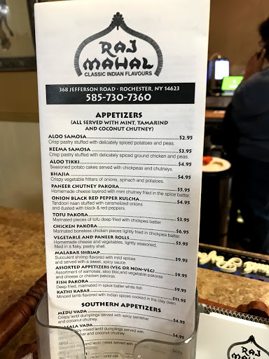 The Raj Mahal may be one of Rochesters best kept secrets. The Raj apparently uses the same chef from the original Raj Mahal on Monroe Ave. Expect some of the best, if not THE best Indian food youve had -- and cordial staff in a very pleasant setting. Highly recommended. My wife and I cant wait to get back.