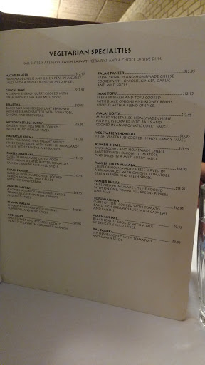 Disappointing selection for lunch. Several of the vegetarian dishes had mostly sauce. There are other very good Indian restaurants close by. All much better. Sorry