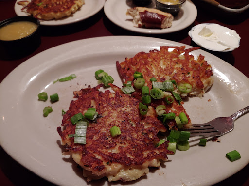 Had the German Plate, with pork belly, knockwurst, and pork schnitzel. The schnitzel was fried crisp with just the right amount of gravy and sauteed mushrooms; the knockwurst was tender and savory, but the star was the pork belly: flavorful, moist and tender, like a pork sparerib roasted until its fall-off-the-bone tender. The German potato salad was good, the sauerkraut was better. For dessert, a delicious apple strudel with a light caramel sauce, browned, crisp but flaky, and with just a small amount of apple to give it a good flavor profile.