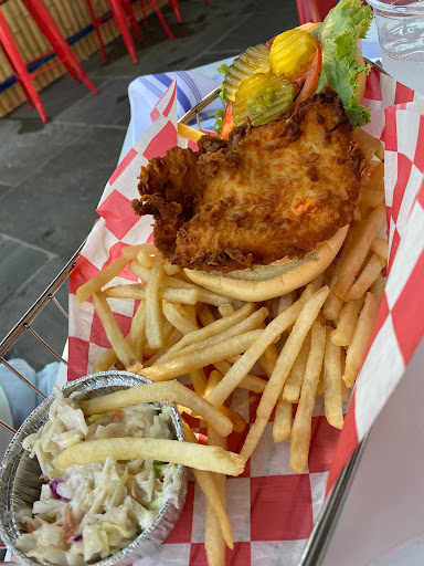 Nice outdoor seating with friendly and attentive service. Our table had 2 orders of fish and chips however the fish fillets were undercooked. The fries that came with them were really good though. Id definitely go back and try something else. The drinks are good and the view of the water is perfect.