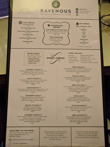I love the crepes here! It is rare to find a good crepe eatery and this is an excellent one. Visited Saratoga Springs for 3 days and ate at Ravenous every day because the food is superb. Everything on the menu is delicious and the Moroccan mint iced tea was perfect. If they were near me I would be poor, fat and happy! (...because I would spend all my money eating the rich foods found within.)