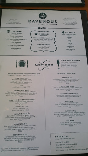 So we came up to Saratoga to get water at the spring. It was slightly packed with lined people waiting to fill up, so we decided to venture down town for a bite. I opened Google , searched brunch, and picks Ravenous after a quick read on crepes (hubbys way to his heart AND his bday weekend) I told him lets go here. First impression, full place! She told us 20 min and would text us. TOTALLY WORTH the lil 20 min stroll checking out the honey and tea shop (so cool). We ordered a creme Bordeaux and green mountain, iced Morocco green tea and hot apple cider. The drinks were delicious and satisfying! The food was fantastic! The crepes are little breading and packed fully of yummies! They are just satisfying, not too heavy on your tummy, but just enough to leave a satisfying tummy. :) I was very pleased and impressed! 2 cooks who looked like they had a great flow/system to their work and hostesses were smiling and busy :) I will def want to return on Saratoga visits!! Keep up the great work, cause you guys have a great taste of food!