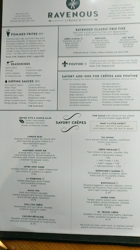 Ive had crepes in France, Britain, Montreal and downtown Ballston Spa, and the tough, dry rubbery concoctions served at Ravenous arent even passable as edible. Our party ordered $60 of food that I wish I could get back. We thought the desert crepes would redeem the rest of the meal- the same rubbery Dunkin Donuts-like wrap complete with CANNED peaches. Ordered the Poutine and I can count the cheese curds on one hand and the gravy had to have been a McCormicks pouch sauce. Local delis do that dish better too. I could go on, but you get the gist. It was our first time eating there and the last time. Too bad.