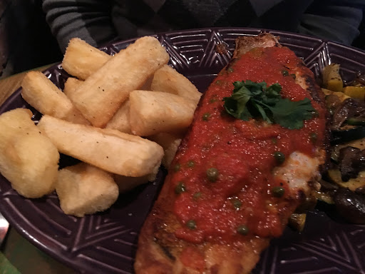 We ate at the bar. Waited about 20 minutes for a spot at the bar to open up but the atmosphere was good. When we sat at the bar we waited 10 mins and i had to ask the bartender to clear the prior customers drinks, plates, etc. and then asked her to wipe the counter. when i did sje got a little annoyed can you imagine? Im the customer wanting a clean place to eat and she was annoyed at me . i ordered the snapper. for $20 it was cold, dry and hard as if it was under a heat lamp for a long time. overall a poor experience.