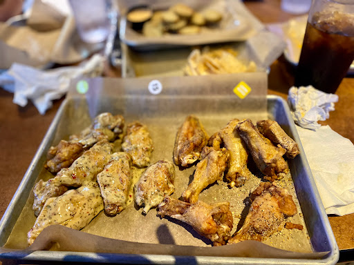 This place is pricey for wings... I get it something has to pay for all those big screens. But the take-out area is always a long wait and not because theres a lot of people. Its because I guess the cashiers are doing everything. I could never understand how other than teenagers can somebody pay so much for a winglet.