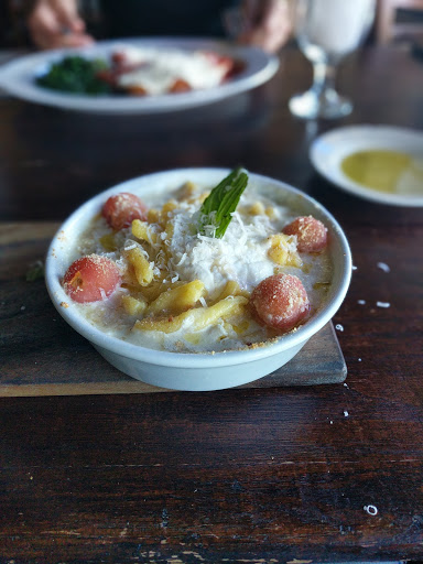 Food is excellent ... Favorite dish, Rigatoni Bolognese ... bread (crispy pizza dough) with EVOO is addicting. Attentive wait staff and the owners, husband & wife, are amazing people. If it werent for the loud noisy, boisterous people in the front part of the restaurant, I would have definitely given the restaurant FIVE STARS.
