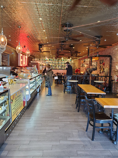 This place as a lot of delious and reasonably priced baked goods and sweets (many being around $3). They also offer breakfast and lunch menus. Many customers stay there to eat thier delious desserts in the bakerys retro and somewhat hipster atmosphere. The place is full of fun and cute decorations most notably busting of a red superman loving phone boot, a subway sign, a tall fireplace, and a life sized statue of a man seating atop the rafters. Although most of their food is great, among the most amazing and popular are their french toast and pancakes (accompanied by buttery egg batter), NYC cheesecake, red velvet shake, and focaccia.