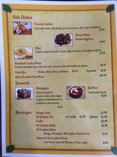 So I stopped by here on a Sunday afternoon, and I am writing this review as a confession of sorts. As my girlfriend and I entered, a woman greeted us and offered any table in the restaurant, as we had happened to be the only customers there. We chose a booth next to a small window and talked over a squeaky table. I said to my girlfriend that I wasnt having a great first impression, and that we may have made a mistake. Shortly after, we were given 2 menus: 1 typical American; hamburgers, buffalfo wings, jalapeno poppers, etc. and 1 Sri Lankan menu; about 6 or 7 items on this menu in total. My girlfriend and I both chose 2 different items from the Sri Lankan menu. 15 minutes later our food was presented, and here is where my conviction for writing my first restaurant review in my life begins. I cant come up with any decent foodie words to describe the food I ate, but it was simply amazing, and incredibly satisfying. I forgot about the empty restaurant, my reservations about the decor and settings, and indulged in one of the best prepared and best tasting dishes Ive eaten in long time. This small, quaint, unintriguing restaurant on 9D is a special secret. A secret that should be shared, and dont you let it be a secret, go and have a dish here. Inexpensive, healthy, and delicious. I also want to add that the chef, and apparent owner, was incredibly friendly, enthusiasitc, confident, and genuine. He told us that on Fridays he has a Sri Lankan buffet, with everything cooked in sight, and I certainly am looking forward to next Friday, Ill be there. Anyway, in short, just go get some food here. If you dont, I dont care, but your tummy will.