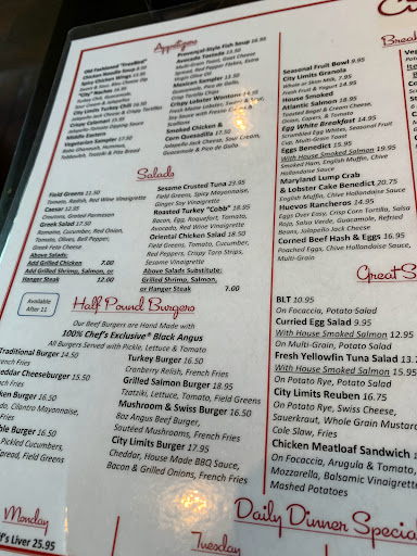 Best diner Ive ever experienced. Its in a category way above that of the typical diner. Youll notice that whatever you order, the dish will have been prepared with care & expertise. Im kind of picky and have never been disappointed with any items on their menu. The place has a pleasing decor and ambience. It stays busy because they have established a strong reputation for quality of food and service. The management is apparently excellent. Weve been fairly regular for many years. City Limits is a definite locals favorite.