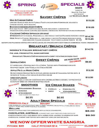 NOTE: My rating is 3-1/2 stars. (I hope that someday Yelp allows us to do that.) We were visiting Clark Botanic Garden (about 5 minutes away) and wanted to have some lunch. I opened the Yelp app to look for something fun / different nearby. When I saw Fresco Creperie (5 minutes away; excellent reviews; girlfriend loves crepes!) I knew this was the place. ** Initial impression ** - I didnt care for the decor. Not exactly sure how to describe it - but to me it felt a little cold. The restaurant is somewhat long and narrow (imagine a galley kitchen). The front has very large windows (which does help) but it still felt just a little claustrophobic to me. ** The menu ** - A decent selection, but I felt they were missing some of the "basics". I didnt see too many breakfast crepes. I like crepes that are almost like an omelet - scrambled eggs with cheeses (american, cheddar, swiss, mozzarella), meats (ham, bacon), and maybe some veggies (tomato, onion, mushrooms). Its possible they gave us a lunch menu (because it was around 1pm) but I would have liked more "breakfast type" options. I am also a big fan of mozzarella cheese and I did not see that listed as an option. As far as what was on the menu, there were some really nice (unique) choices. Apple & Brie, for example. My girlfriend tried the soup of the day (potato leek). Potato leek is one of her favorites and she said it was excellent! Savory crepes are served with a small salad. It tasted very fresh and the dressing was really nice - a little vinaigrette, slightly tangy but not overpowering. ** The service** - Things were a little off when we went. (I have to agree with Justins comment: "Wait staff is a slow with brining out just our coffee or tea".) Someone took our order fairly quickly, but then they forgot to bring the drinks that we ordered (a Pepsi and a Café au lait). Its important to note that once they realized they (1) brought the drinks right over, (2) apologized and (3) gave us the drinks for free. The Café au lait was actually quite good. ** The prices ** - Very reasonable. With our drinks being "on the house" the bill was around $25. No complaints there. Would I return? Yes, but only if I happened to be in the area. The food was good but I dont think Id go out of my way to get there. Sweet n Savory in Patchogue is still (hands down) our favorite!