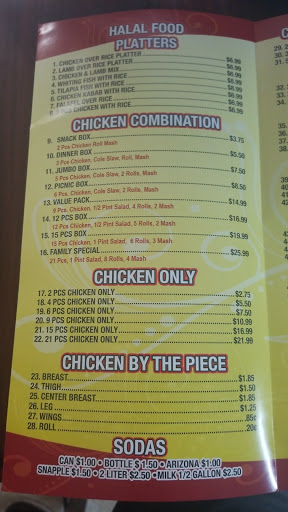 Great fried chicken and very reasonable prices their halal food is delicious also i really love the fried corn nuggets. Their menu is huge with many options and they also have ice cream.