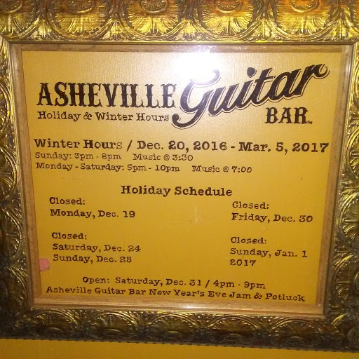 If you like stringed instrument live music , particularly guitar, this is the place. Best of all the owners, who are almost always there, are the best. They introduce themselves and try and make you feel part of the community without being intrusive. Good beer and wine selection and some sort of live music every night. In short, if you are lucky enough to be in Asheville check this place out, its only open 5pm to 10ish.