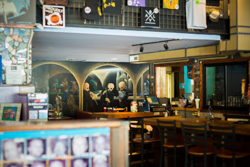 I come to Asheville Brewing mostly for the $3 movies but I do also order food and beer to have while watching. I love the decor and while it can get noisy during the film, its still a lot of fun and besides, where else are you going to get a meal like this instead of just overpriced popcorn and candy or a movie less than $10? The service is usually pretty good, friendly staff and the wait for food and drink isnt bad at all while at the bar or seated at a table. The lines to order while in the theater can be painfully slow though so I suggest getting there about a 1/2 hour to 45 minutes early to get that taken care of without a line. Ive sampled a few beers on draft that were decent to meh but there are a few that I choose over most others in Asheville. The Perfect Day IPA is a blast of citrus awesomeness and the Ninja Porter is rich and satisfying. I often drink the Rolands ESB and the Scout Stout too. They have some great specials popping in as well, the Ashevillain was a nice mix of Stout and IPA and the Carolina Special was indeed just that. For food, I have enjoyed the burgers, Royale with Cheese 1/4 lb being my goto, and the fries and onion rings are plentiful and tasty as are the nachos. The pizza however, is hit and miss for the most part. Being from NY, I have been searching for a good equivalent or substitute pizza since I arrived in Asheville 4 years ago.... still on the lookout. AB has a lot of choices for their crust, size and toppings but it seems Ive never had the same quality twice in a row. The toppings are quite expensive but Ive rarely received what I would consider a fair amount for that cost. I also find the pie to be cooked unevenly, with barely melted cheese on one side and burnt and hard on the other. The last two times I ordered single slices, there was only cheese and toppings from the crust to about 1/3 of the way down. Very thin and dry the rest of the way, I almost cut the roof of my mouth with the hard sharp edges. Not a good thing, pizza shouldnt crunch and crack unless youve ordered it with Cheetos on top. I feel for the cost of the pizza, I should be able to expect a pleasurable meal and some consistency. It would be nice. Dont skimp on the toppings when you charge over $2 each(on pies), especially not with the less expensive ones like veggies and extra cheese. Overall, Id say if youre going out to enjoy a movie and some pub food and some great brews and youre not expecting gourmet artisanal fare and fine or fancy decor, youll probably think this place is a ton of fun. If youre just not into the laid back vibes and are looking for something more impressive to look at or eat, go out someplace else before you get here for the show :) Great beer, fun atmosphere, cheap movie tickets. Ill be back again and again