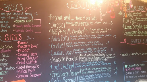 Allow me to start by saying that theyre biscuits are a hard, dry, and dont hold form, they try to hard on theyre flavor combination to where they completely fail in all accords. Theyre only saving grace is there sauces which seemingly has everyone fooled, not to mention the business in general is adding to the way over gentrification of Asheville and in the process stealing business away from all the local businesses that have been here longer than most people/tourists/yuppies who live here nowadays. Furthermore the place is so crowded with a way to long line that all in all creates an atmosphere of a freaking amusement park; if your actually from Asheville, and when I say from Asheville I mean born a raised, youd see this whole tourist attraction of a spectacle utterly preposterous!