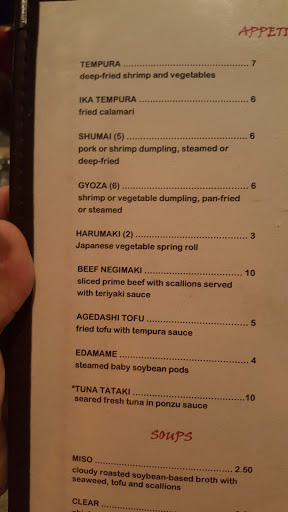 You can eat at the sushi bar, at the group tables where the chef frys everything and puts on the usual show flipping food into tiny bowls and plates, or you can be seated at a regular table and order from the several menus. We ordered from the sushi menu at a regular table. Wonderful food, and the price was very good (even compared to Houston, TX restaurants). The menu choices were enormous. Definitely one of the best Japanese restaurants we have ever been to. We ate far too much, but it was all very delicious, and all the items were obviously very fresh.