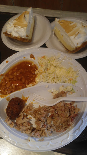 BBQ: Extremely good. Slaw (regular, not BBQ): very good. Hush puppies: too big, too greasy, too overcooked. Lemon Pie: not "homemade" but good nonetheless. Staff: friendly and efficient. Do not pass up a chance to eat here, just avoid the hush puppies (literally dripping grease, soaked through nearly all the way to the center). Yes, the BBQ is "dry." But what that means is they dont slather it with sauce or grease; so you get to taste the meat unadorned. Put as much sauce on it as YOU want; I prefer it plain, dry, without grease and fat drippings, and then I add a little sauce. Others prefer greasy, fatty, sauce-heavy meat; go elsewhere if so.