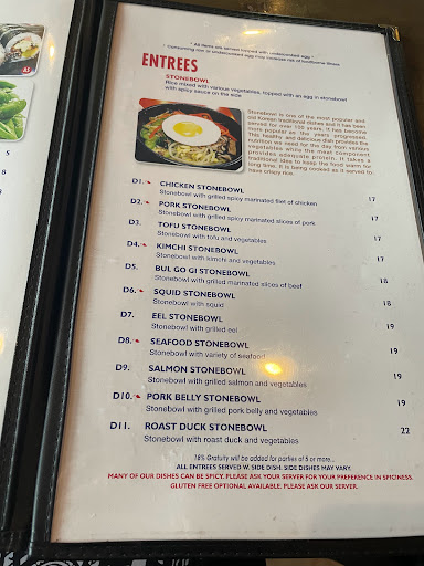 Excellent! Tried the stone bowl for the very first time. Its a party in your mouth. I cant wait until next time to try it crunchy! My honey got the Galbi (our favorite) it was excellent too! I certain everything else is good too. One can tell when entering the door when it smells good! Cant go wrong with this stop!