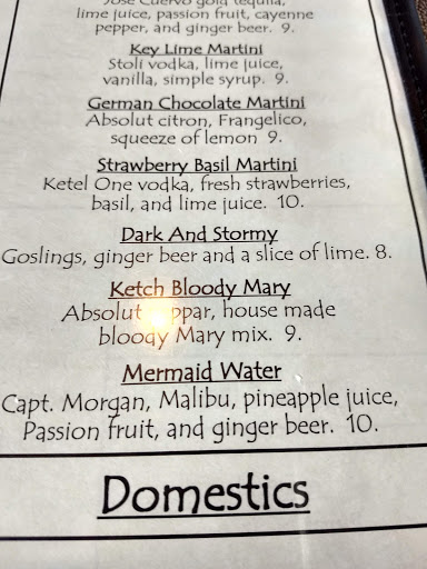 My wife and I really enjoyed dining at Ketch 55. Our waiter was excellent and recommended interesting options on the menu. The menu itself reflected the chefs desire to use fresh and creative ingredients in all of his dishes. I had the shrimp and grits, which came highly recommended by our waiter and others in the restaurant. It was delicious and our overall dining experience was terrific. I would recommend it if you are looking for a slightly upscale option with exceptional fresh menu choices. Expect to spend $20-25 per person for entrees.