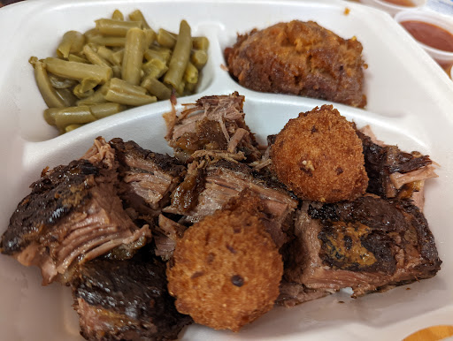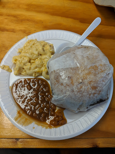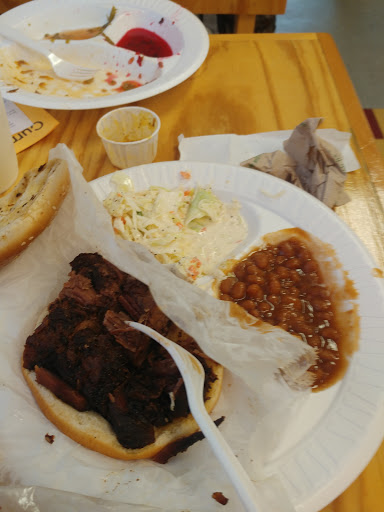 I dont understand how this place has such good reviews. We stopped here yesterday for lunch, and I had a brisket platter. It tasted like it was bought frozen and pre-cooked. There was no flavor. It was not smoked. I was not impressed with the sauce I used by any means. The beans they gave me as a side were disappointing. I would rather just heat up a can of Bushs; it would taste a lot better. I ordered jumbo size, but I was still hungry when I finished eating. My wife had the pulled pork platter, and did not like it at all. She did like the mac and cheese side and said they had good sweet tea. Im not in to sweat tea, so Ill take her word for it. The potato salad I had was ok, but not worth the price I paid. I smoke meat myself at home, and know how to make my own bbq sauce. Perhaps all these other reviewers just dont know what bbq is supposed to taste like. Highly disappointed. I will not stop here again, and dont recommend it to anyone.